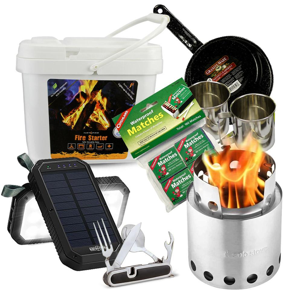 This all-in-one cooking kit has everything needed to cook a meal or boil water in an emergency or on an adventure.